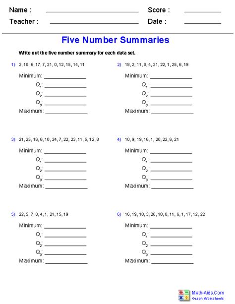 5 Number Summary Worksheet. Web five number summaries write out the five number summary for each data set. 1) 3, 11, 8, 19, 25, 17, 13, 22, 9, 1, 6 minimum:.