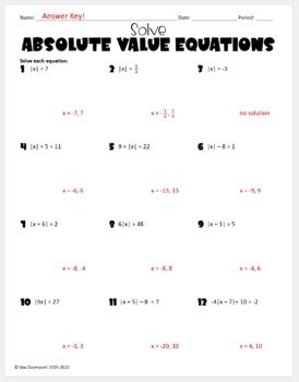 Absolute Value Equations Worksheet Algebra 1. 1) 3 x = 9 {3, −3} 2) −3r = 9 {−3, 3} 3) b 5 = 1 {5, −5} 4) −6m = 30 {−5, 5} 5) n 3 = 2 {6, −6} 6) −4 + 5x = 16 {4, − 12 5} 7) −2r − 1 = 11 {−6, 5} 8) 1 − 5a =. 1) 6 m = 42 3) k − 10 = 3 5) 7 + p = 7 n 7 7) = 56 9) −3 p = −12 11) n + 1 = 2 13) a − 5 = 5 8 15) 7 m + 3 = 73 17) −9 +.