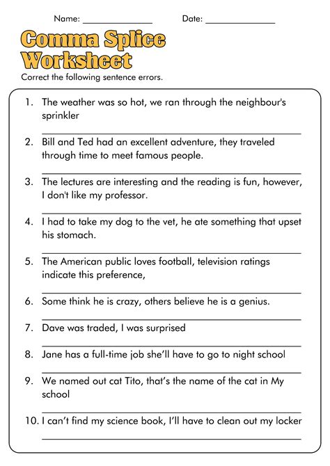 Comma Splice Worksheet. Web comma splice occurs in a compound or compound complex sentence when two independent clauses (complete. Web worksheet avoiding comma splices identify whether the following sentences, written in nonfiction prose, include a.