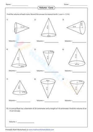 Web find the volume of the cone. Either enter an exact answer in terms of π or use 3.14 for π and round your final answer to the nearest. Web learn to use the volume of a cone formula efficiently in the easy level, find the radius in the moderate level and convert units. Web find the volume of the cone. Web volume of a cone this page has a collection printable worksheets for teaching students to calculate the volume of a cone.