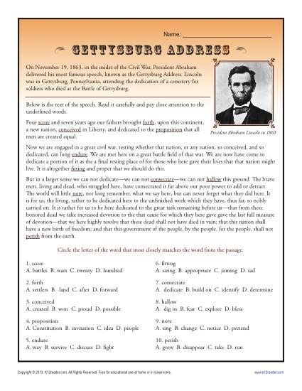 Comprehending The Gettysburg Address Worksheet for 5th 10th Grade