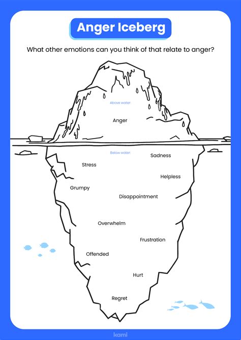 Iceberg Anger Worksheet. The anger iceberg represents the idea that, although anger is displayed outwardly, other emotions may be hidden. This is the emotion you typically feel and express outwardly.