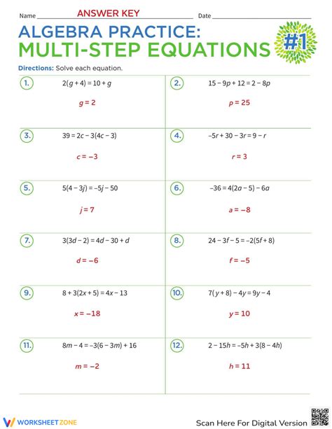 Multi Step Equations Worksheet Algebra 1. 1) −20 = −4 x − 6 x 3) 8 x − 2 = −9 + 7 x 5) 4 m − 4 = 4 m 7) 5 p − 14 = 8 p + 4 9) −8 = −( x + 4) 11) 14 = −( p − 8) 13) −18 − 6 k =. 7) −56 = 7(3 +.