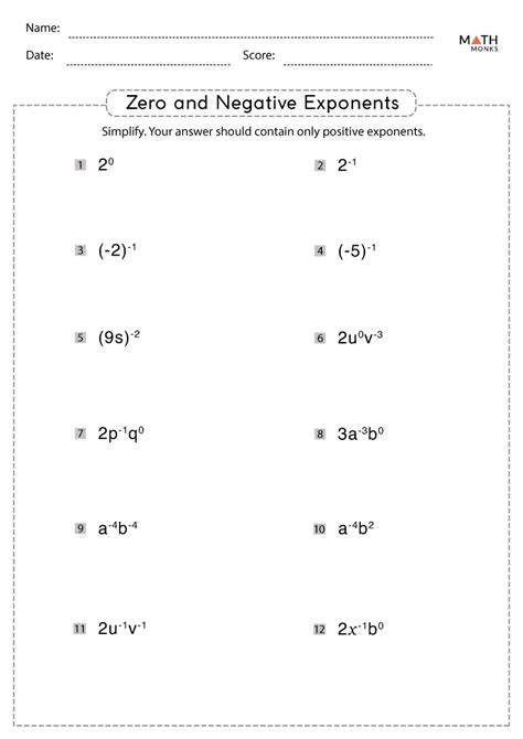 There are also powers and. Both are easy to print — and the html form is editable. The worksheets can be made in html or pdf format. 1) 63 63 2) 62 62 3) 84 84 4) 2−1 1 2 5) 7−2 1 72 6) 52 52 7) 54 ⋅ 5−4 ⋅ 53 53 8) 2 ⋅ 22 23 9) 2 ⋅ 2−4 1 23 10) 7−4 ⋅ 73 1 7 11) 8 ⋅ 8−3 1 82. Web options include negative and zero exponents, and using fractions, decimals, or negative numbers as bases. You can also make worksheets that have one other operation besides exponentiation. Your answer should contain only positive exponents. Here we will learn about negative powers, including what they are, how to simplify and evaluate them, and how to combine them with other laws of exponents. Web negative exponents #1 simplify. Your answer should contain only positive exponents.