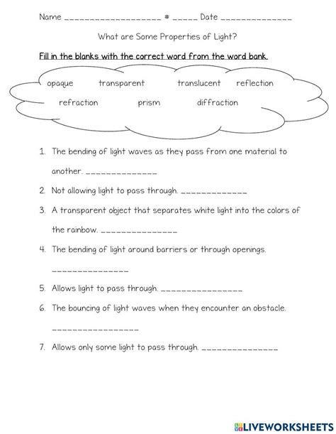 Properties Of Light Worksheet. The energy of light waves is known as ____________________ radiation. ____________ travels through water to create waves.