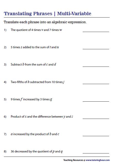 Translating Algebraic Expressions Worksheet With Answers